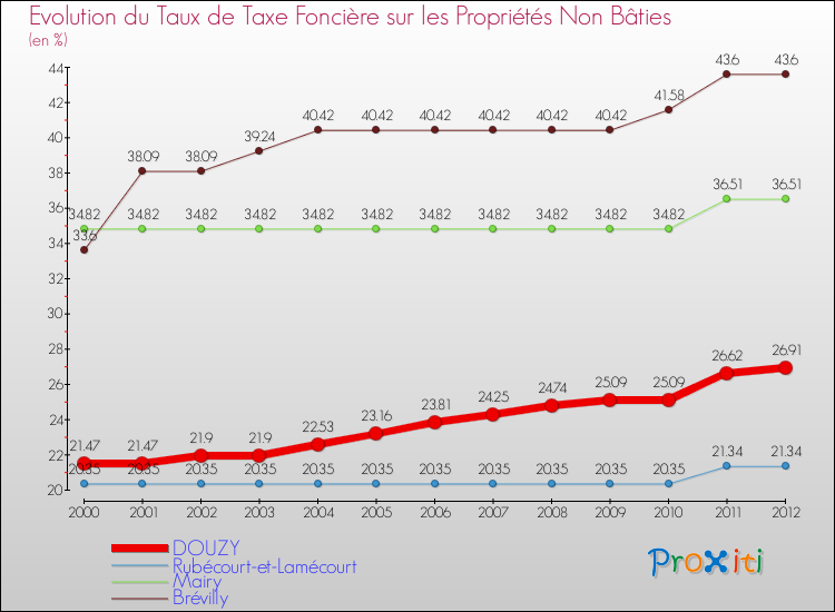 A Douzy, le taux de taxe foncière sur le non bâti a donc augmenté de 25.34 % entre 2000 et 2012.