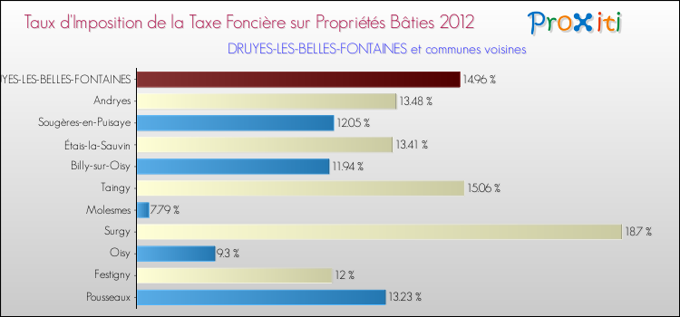 A noter : la valeur moyenne de ce taux de taxe foncière sur le bâti dans les communes françaises similaires à Druyes-les-Belles-Fontaines était de 11.88 %, en 2012.