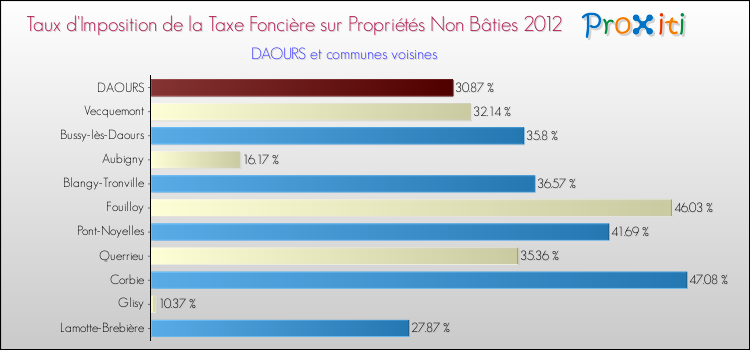 En 2012, le taux de la taxe foncière sur le non bâti vôté par le conseil municipal de Daours était de : 30.87 %.