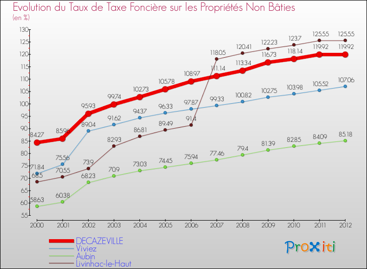 Pendant la même période, les communes françaises similaires à Decazeville, ont vu leur taux de taxe foncière sur le non bâti augmenter de 23.46 % en moyenne entre 2000 et 2012.