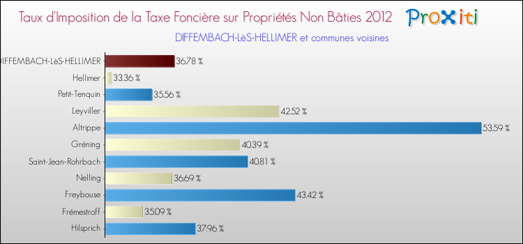 En 2012, le taux de la taxe foncière sur le non bâti vôté par le conseil municipal de Diffembach-lès-Hellimer était de : 36.78 %.