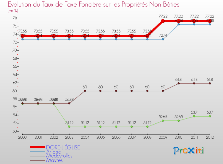 A Dore-l'Église, le taux de taxe foncière sur le non bâti a donc augmenté de 4.99 % entre 2000 et 2012.