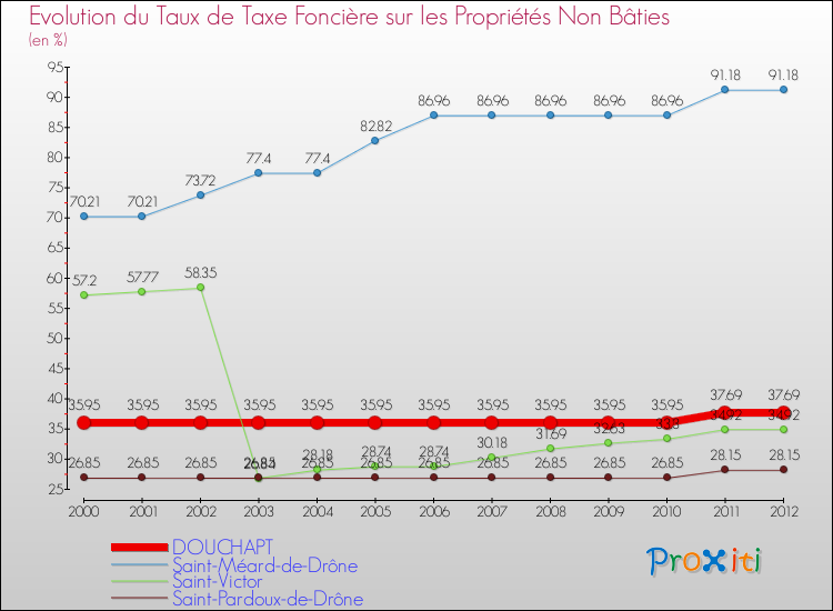 Pendant la même période, les communes françaises similaires à Douchapt, ont vu leur taux de taxe foncière sur le non bâti baisser de 3.59 % en moyenne entre 2000 et 2012.