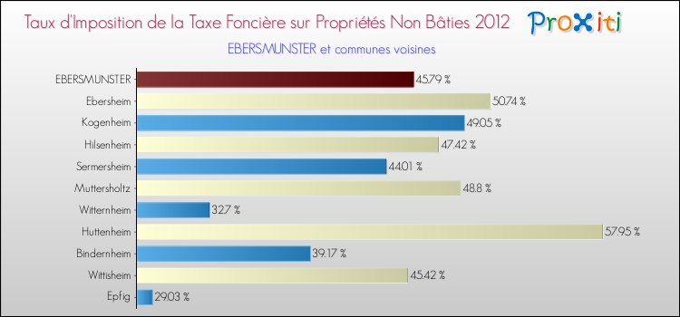 En 2012, le taux de la taxe foncière sur le non bâti vôté par le conseil municipal de Ebersmunster était de : 45.79 %.