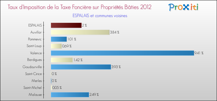 En 2012, le taux de la taxe foncière sur le bâti vôté par le conseil municipal de Espalais était de : 2 %.