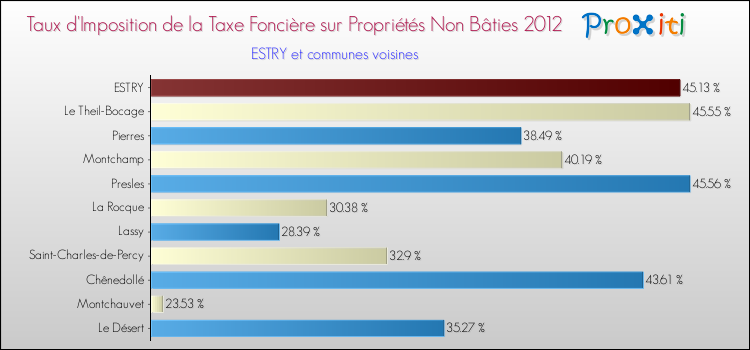 En 2012, le taux de la taxe foncière sur le non bâti vôté par le conseil municipal de Estry était de : 45.13 %.