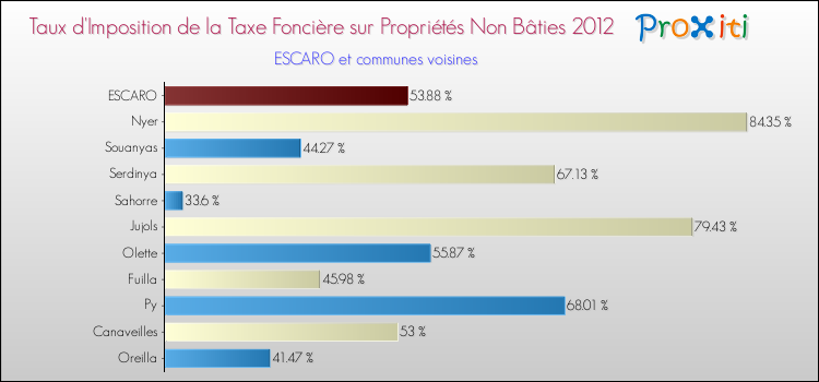Vous trouverez ci-dessous des graphiques qui vous permettent de situer le taux de la taxe foncière sur le non bâti de Escaro par rapport aux communes voisines.