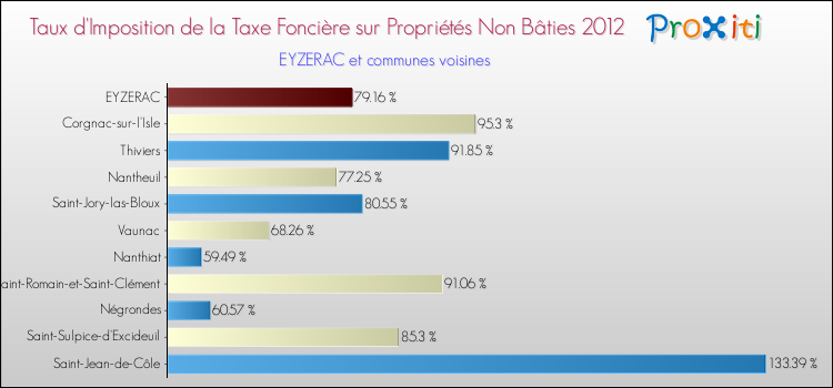 En 2012, le taux de la taxe foncière sur le non bâti vôté par le conseil municipal de Eyzerac était de : 79.16 %.