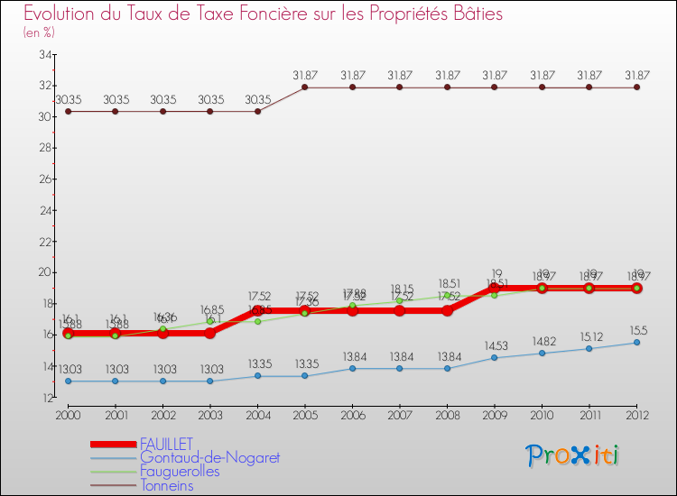 Pendant la même période, les communes françaises similaires à Fauillet, ont vu leur taux de taxe foncière sur le bâti augmenter de 18.78 % en moyenne entre 2000 et 2012.