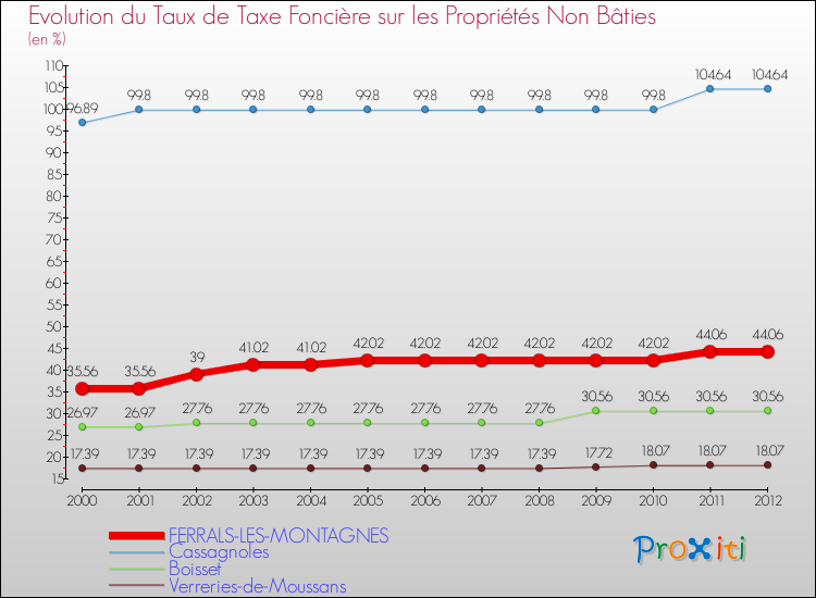 A Ferrals-les-Montagnes, le taux de taxe foncière sur le non bâti a donc augmenté de 23.9 % entre 2000 et 2012.
