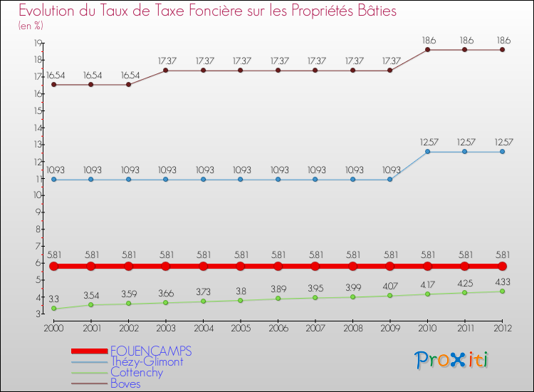 A Fouencamps, le taux de taxe foncière sur le bâti a donc augmenté de 0 % entre 2000 et 2012.