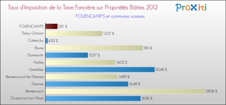 A noter : la valeur moyenne de ce taux de taxe foncière sur le bâti dans les communes françaises similaires à Fouencamps était de 10.09 %, en 2012.