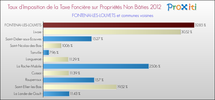 En 2012, le taux de la taxe foncière sur le non bâti vôté par le conseil municipal de Fontenai-les-Louvets était de : 32.85 %.