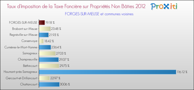En 2012, le taux de la taxe foncière sur le non bâti vôté par le conseil municipal de Forges-sur-Meuse était de : 19.18 %.