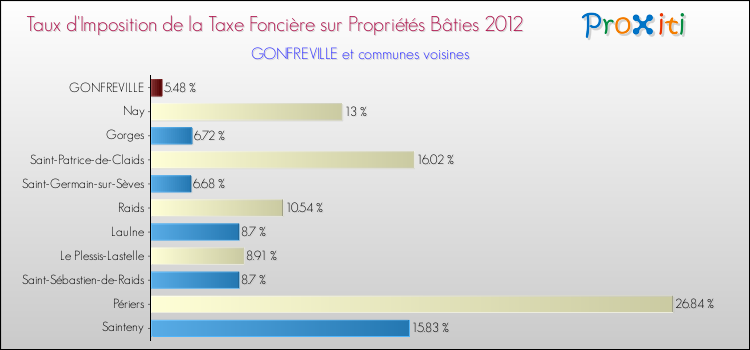 En 2012, le taux de la taxe foncière sur le bâti vôté par le conseil municipal de Gonfreville était de : 5.48 %.