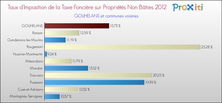 En 2012, le taux de la taxe foncière sur le non bâti vôté par le conseil municipal de Gouhelans était de : 15.73 %.