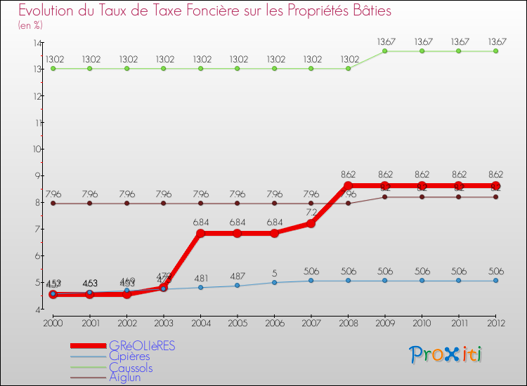 A Gréolières, le taux de taxe foncière sur le bâti a donc augmenté de 90.29 % entre 2000 et 2012.