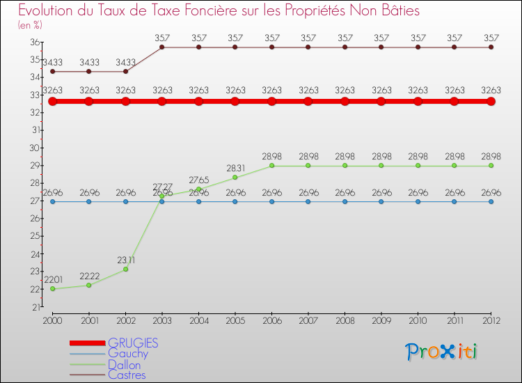 A Grugies, le taux de taxe foncière sur le non bâti a donc augmenté de 0 % entre 2000 et 2012.