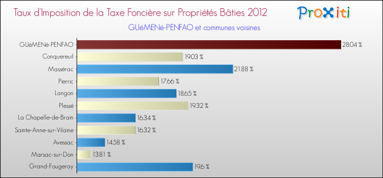 En 2012, le taux de la taxe foncière sur le bâti vôté par le conseil municipal de Guémené-Penfao était de : 28.04 %.