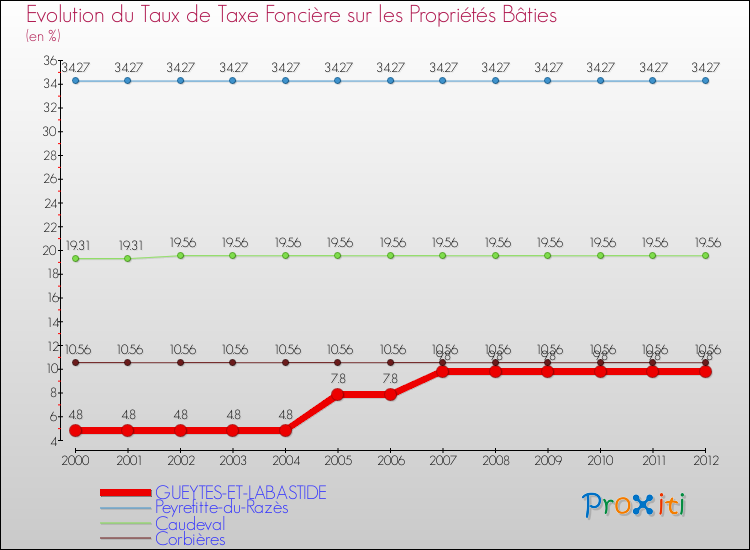 Comparaison des taux de taxe foncière sur le bati pour GUEYTES-ET-LABASTIDE et les communes voisines de 2000 à 2012