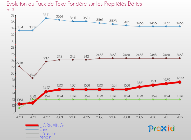 Pendant la même période, les communes françaises similaires à Hornaing, ont vu leur taux de taxe foncière sur le bâti augmenter de 21.83 % en moyenne entre 2000 et 2012.