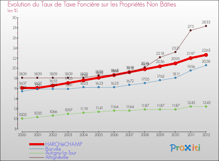 Pendant la même période, les communes françaises similaires à Harchéchamp, ont vu leur taux de taxe foncière sur le non bâti augmenter de 0.85 % en moyenne entre 2000 et 2012.