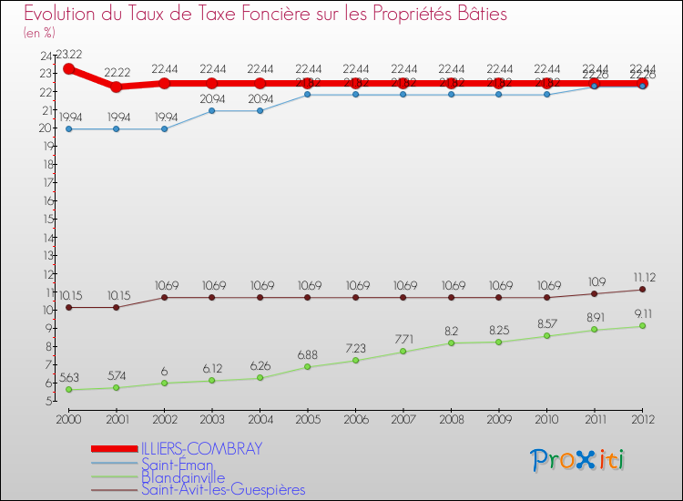 En 2012, le taux de la taxe foncière sur le bâti vôté par le conseil municipal de Illiers-Combray était de : 22.44 %.