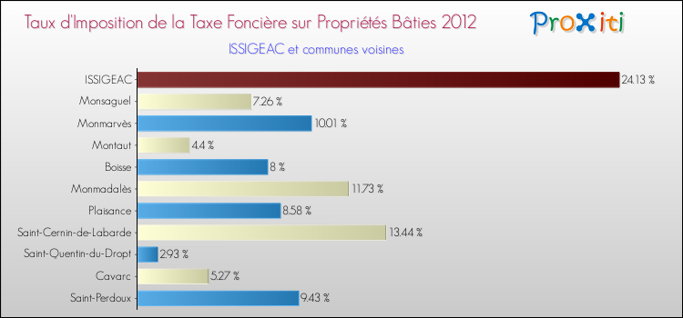 En 2012, le taux de la taxe foncière sur le bâti vôté par le conseil municipal de Issigeac était de : 24.13 %.