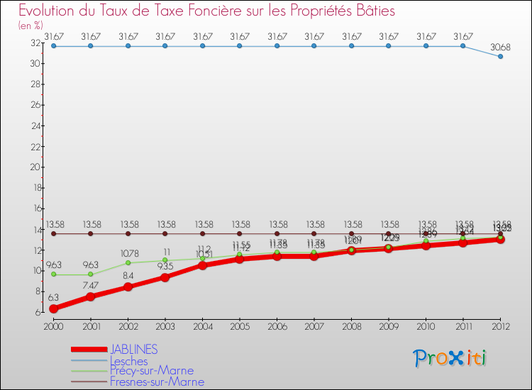 A Jablines, le taux de taxe foncière sur le bâti a donc augmenté de 106.67 % entre 2000 et 2012.