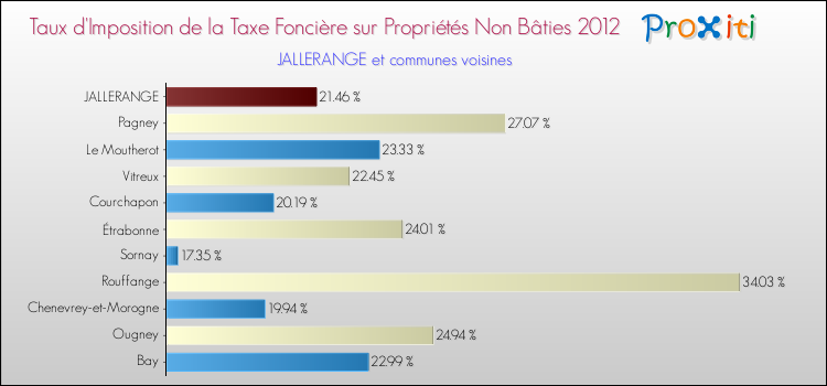 En 2012, le taux de la taxe foncière sur le non bâti vôté par le conseil municipal de Jallerange était de : 21.46 %.