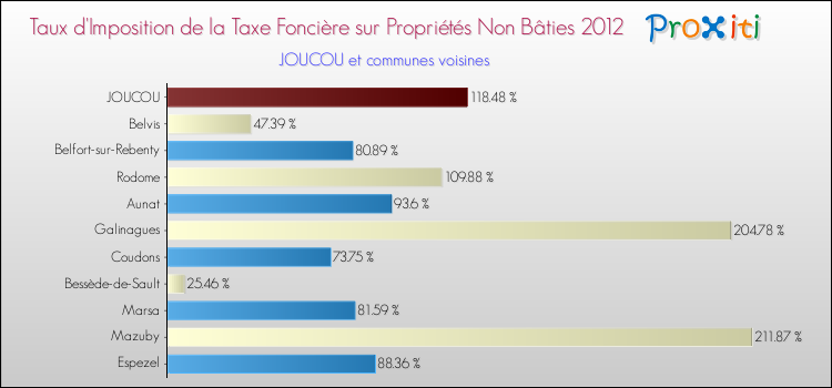 En 2012, le taux de la taxe foncière sur le non bâti vôté par le conseil municipal de Joucou était de : 118.48 %.