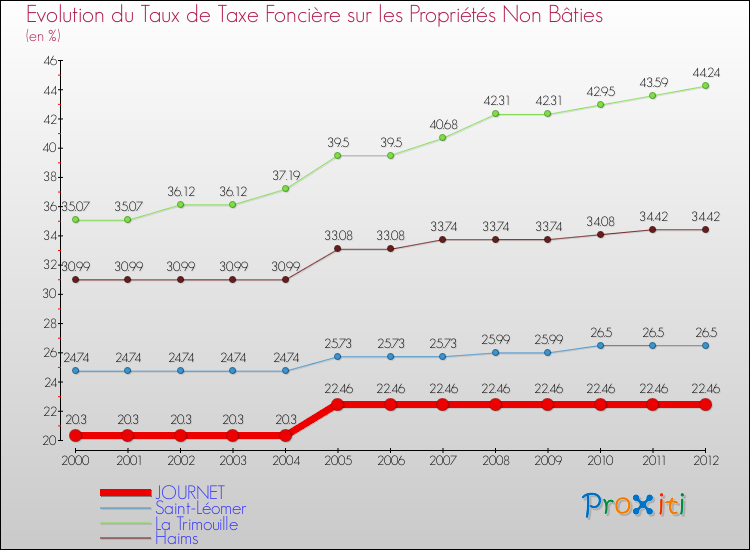 A Journet, le taux de taxe foncière sur le non bâti a donc augmenté de 10.64 % entre 2000 et 2012.