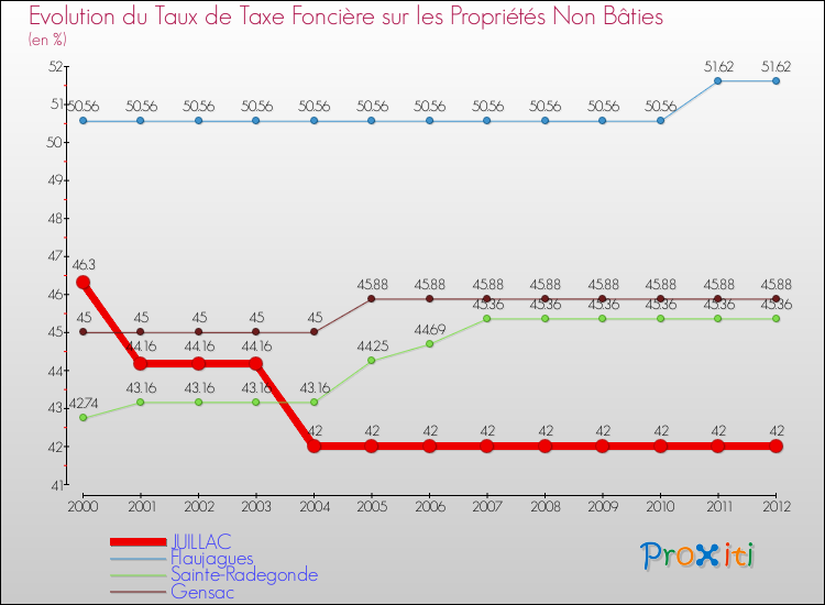 En 2012, le taux de la taxe foncière sur le non bâti vôté par le conseil municipal de Juillac était de : 42 %.