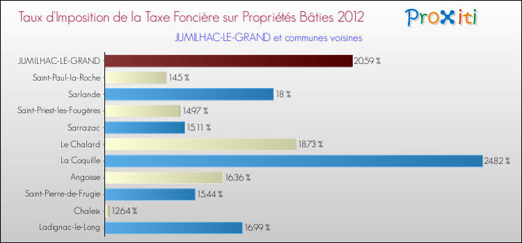 En 2012, le taux de la taxe foncière sur le bâti vôté par le conseil municipal de Jumilhac-le-Grand était de : 20.59 %.