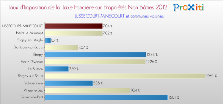 Vous trouverez ci-dessous des graphiques qui vous permettent de situer le taux de la taxe foncière sur le non bâti de Jussecourt-Minecourt par rapport aux communes voisines.