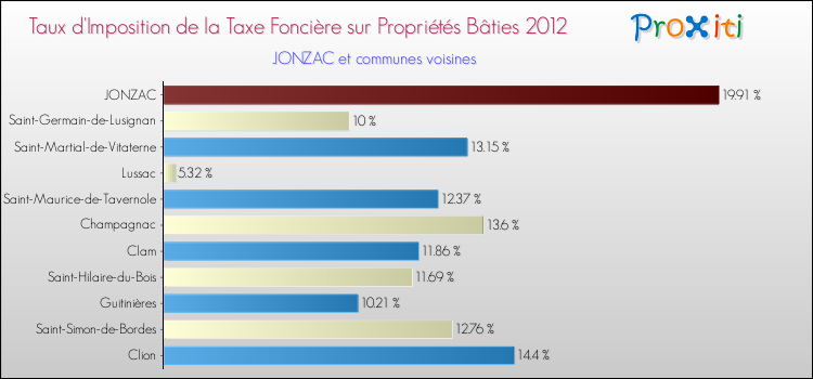 En 2012, le taux de la taxe foncière sur le bâti vôté par le conseil municipal de Jonzac était de : 19.91 %.