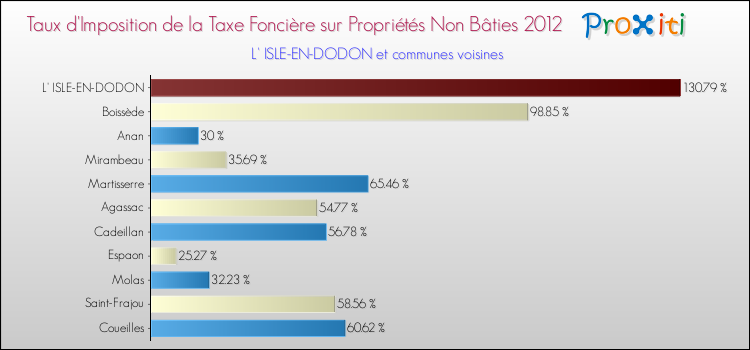 En 2012, le taux de la taxe foncière sur le non bâti vôté par le conseil municipal de L' Isle-en-Dodon était de : 130.79 %.