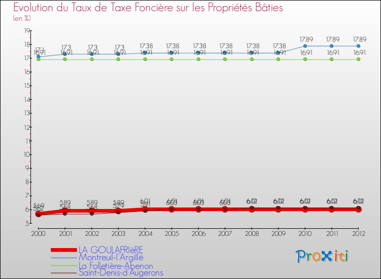 A La Goulafrière, le taux de taxe foncière sur le bâti a donc augmenté de 5.62 % entre 2000 et 2012.