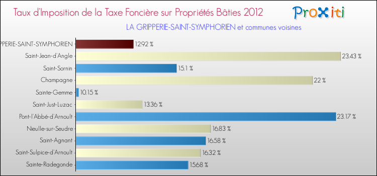 En 2012, le taux de la taxe foncière sur le bâti vôté par le conseil municipal de La Gripperie-Saint-Symphorien était de : 12.92 %.