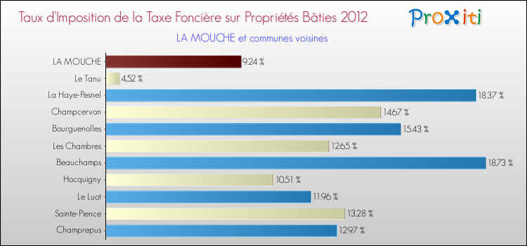 En 2012, le taux de la taxe foncière sur le bâti vôté par le conseil municipal de La Mouche était de : 9.24 %.