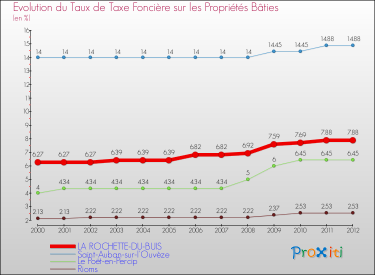 Pendant la même période, les communes françaises similaires à La Rochette-du-Buis, ont vu leur taux de taxe foncière sur le bâti augmenter de 7.68 % en moyenne entre 2000 et 2012.