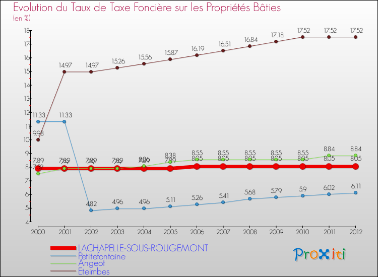 Pendant la même période, les communes françaises similaires à Lachapelle-sous-Rougemont, ont vu leur taux de taxe foncière sur le bâti augmenter de 45.3 % en moyenne entre 2000 et 2012.