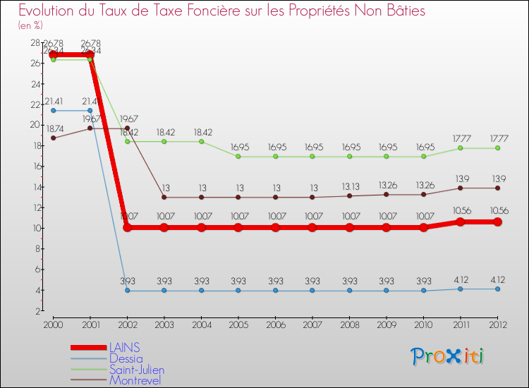 Pendant la même période, les communes françaises similaires à Lains, ont vu leur taux de taxe foncière sur le non bâti baisser de 16.24 % en moyenne entre 2000 et 2012.