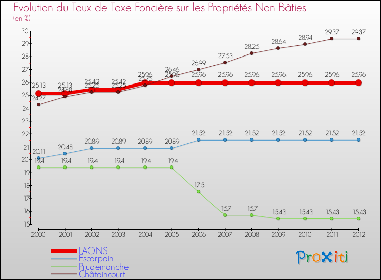 En 2012, le taux de la taxe foncière sur le non bâti vôté par le conseil municipal de Laons était de : 25.96 %.