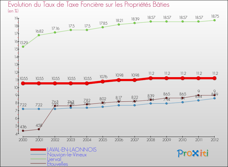 A Laval-en-Laonnois, le taux de taxe foncière sur le non bâti a donc augmenté de 11.24 % entre 2000 et 2012.