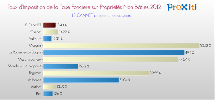 En 2012, le taux de la taxe foncière sur le non bâti vôté par le conseil municipal de Le Cannet était de : 13.43 %.