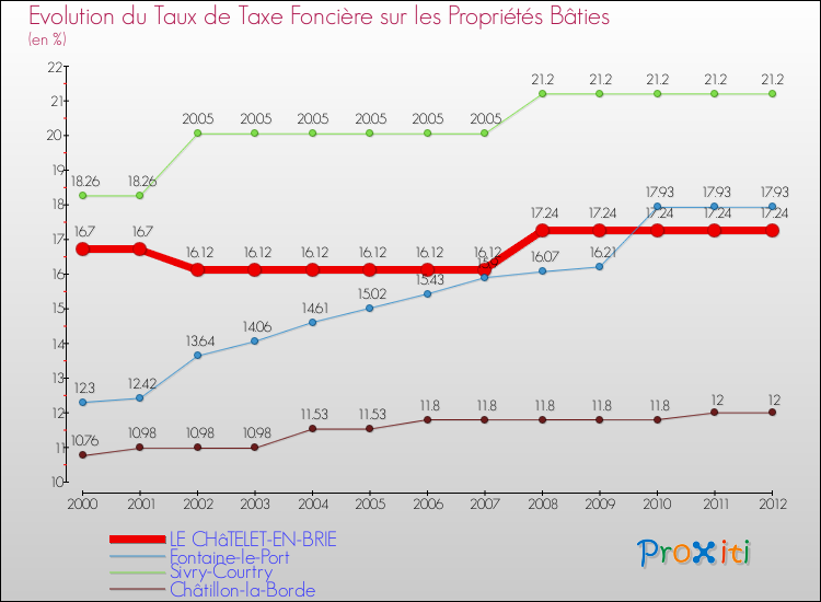 A Le Châtelet-en-Brie, le taux de taxe foncière sur le bâti a donc augmenté de 3.23 % entre 2000 et 2012.