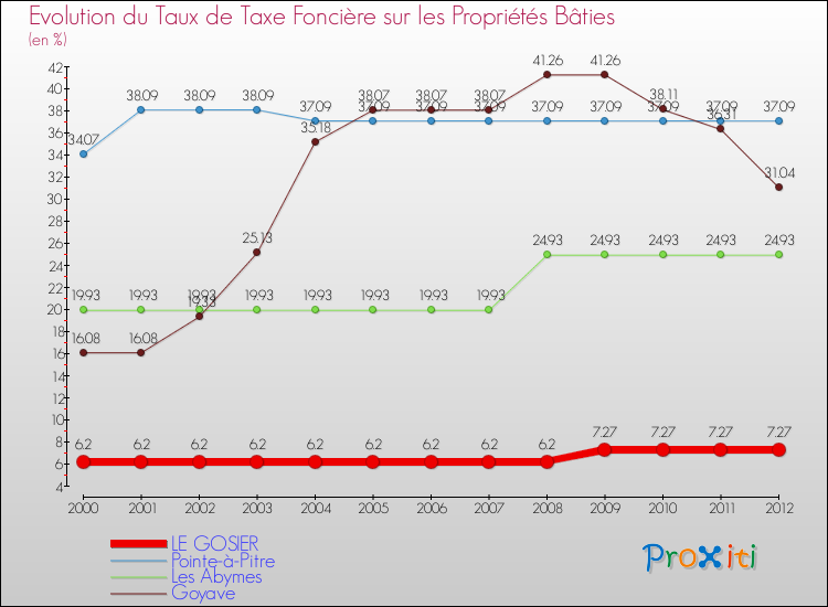 A Le Gosier, le taux de taxe foncière sur le bâti a donc augmenté de 17.26 % entre 2000 et 2012.