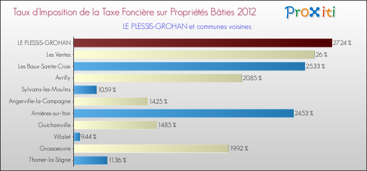 En 2012, le taux de la taxe foncière sur le bâti vôté par le conseil municipal de Le Plessis-Grohan était de : 27.24 %.