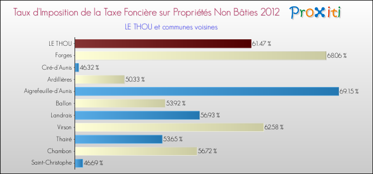 Vous trouverez ci-dessous des graphiques qui vous permettent de situer le taux de la taxe foncière sur le non bâti de Le Thou par rapport aux communes voisines.